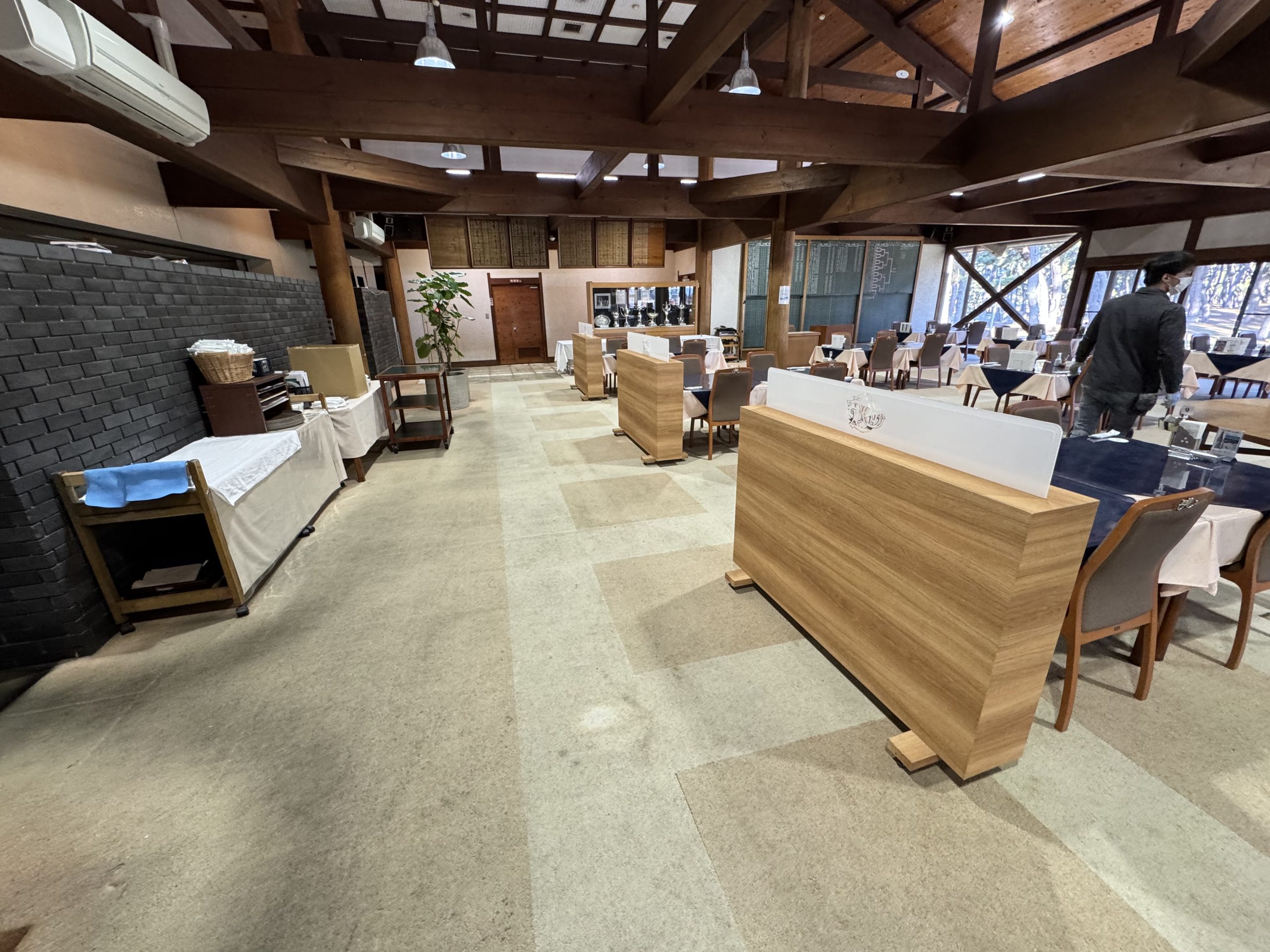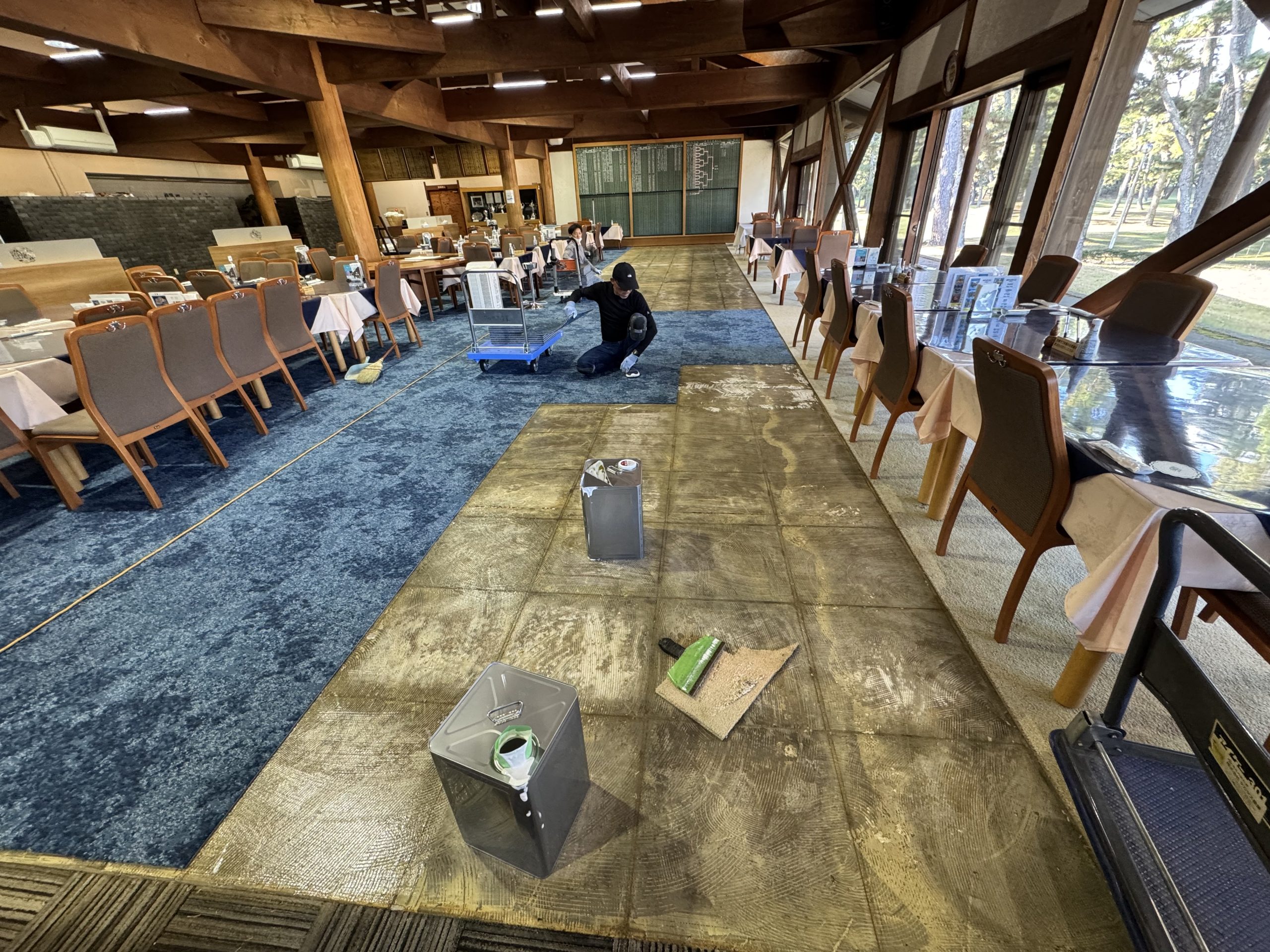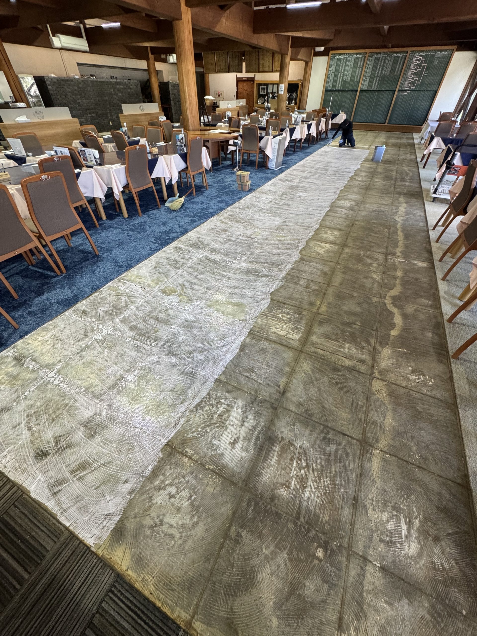 先日、茨城県内の某ゴルフ倶楽部様レストランの床貼替工事をご依頼いただきました。設置物の移動も含め、約390㎡を2日間で貼替だった為、タイトな作業となりましたが、無事工期通りに完了する事が出来ました!